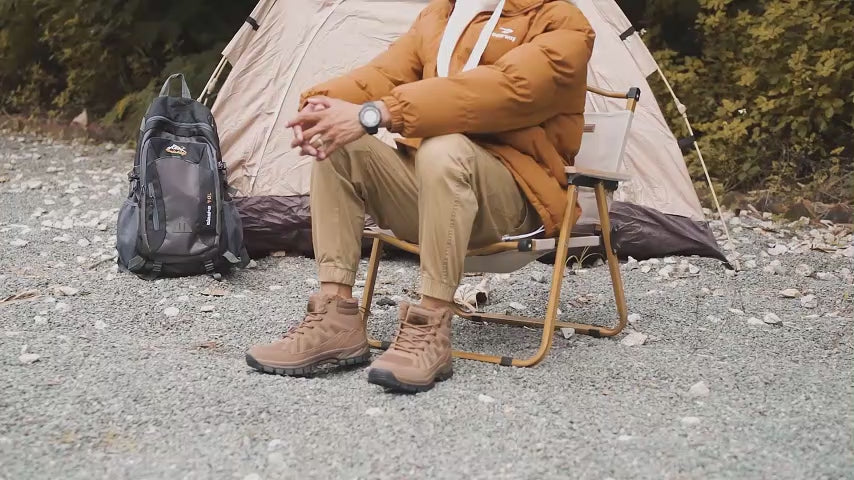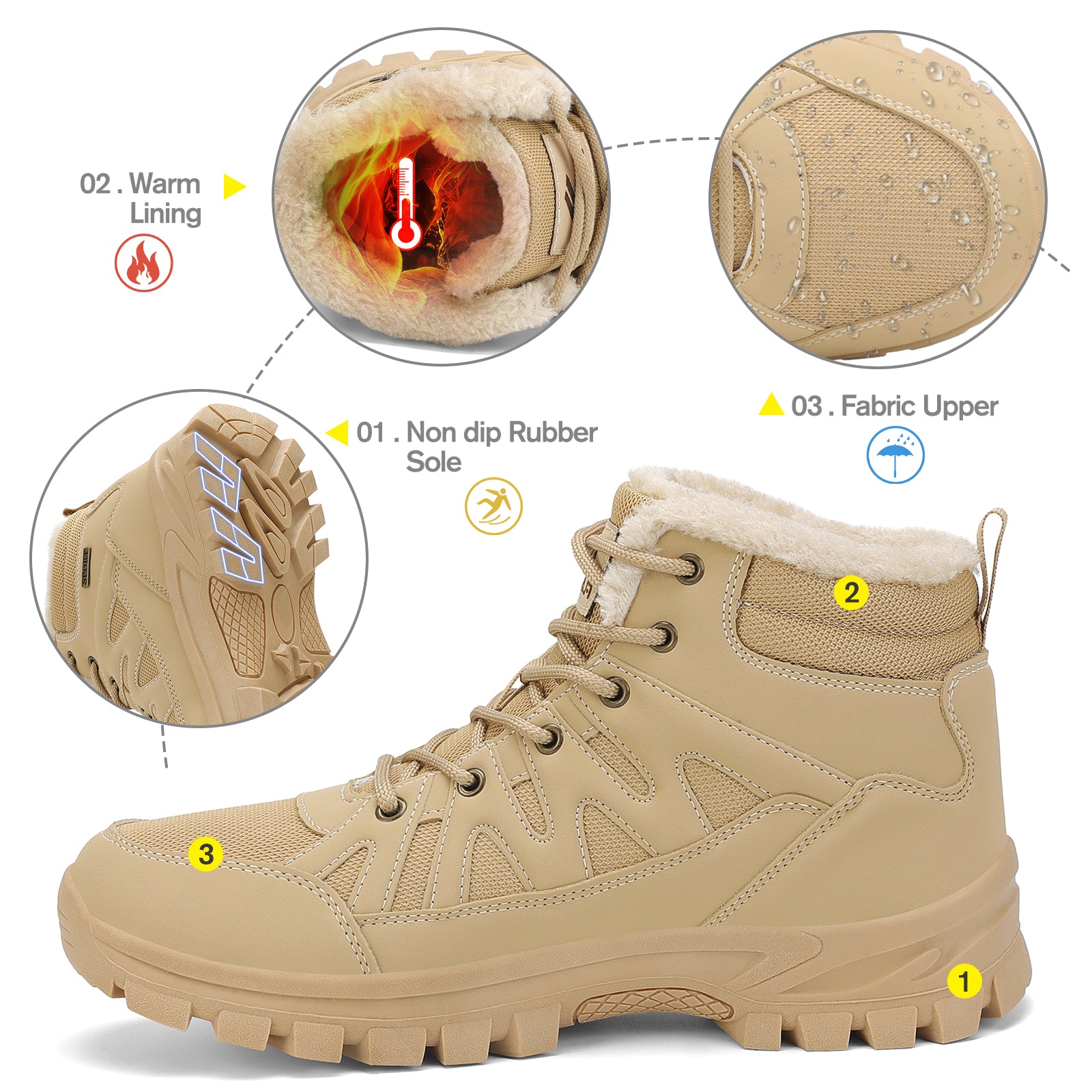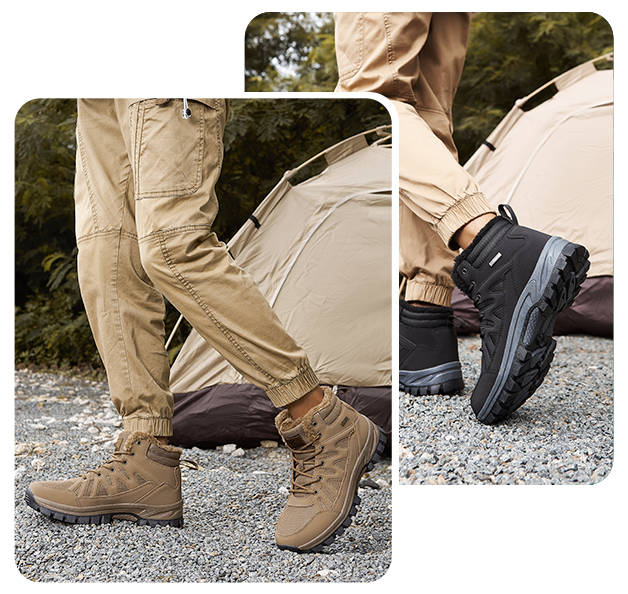 The outer material looks even better in person and repels water and wet snow. Bends perfectly when crouching, no uncomfortable folds or creases. Light weight, unlike all my other heavy winter boots. I can walk, hike and be as agile as possible with less fatigue with these ultra light high tops. Boots can begin to drag you down by the end of the day, not these. I'm seriously impressed.
