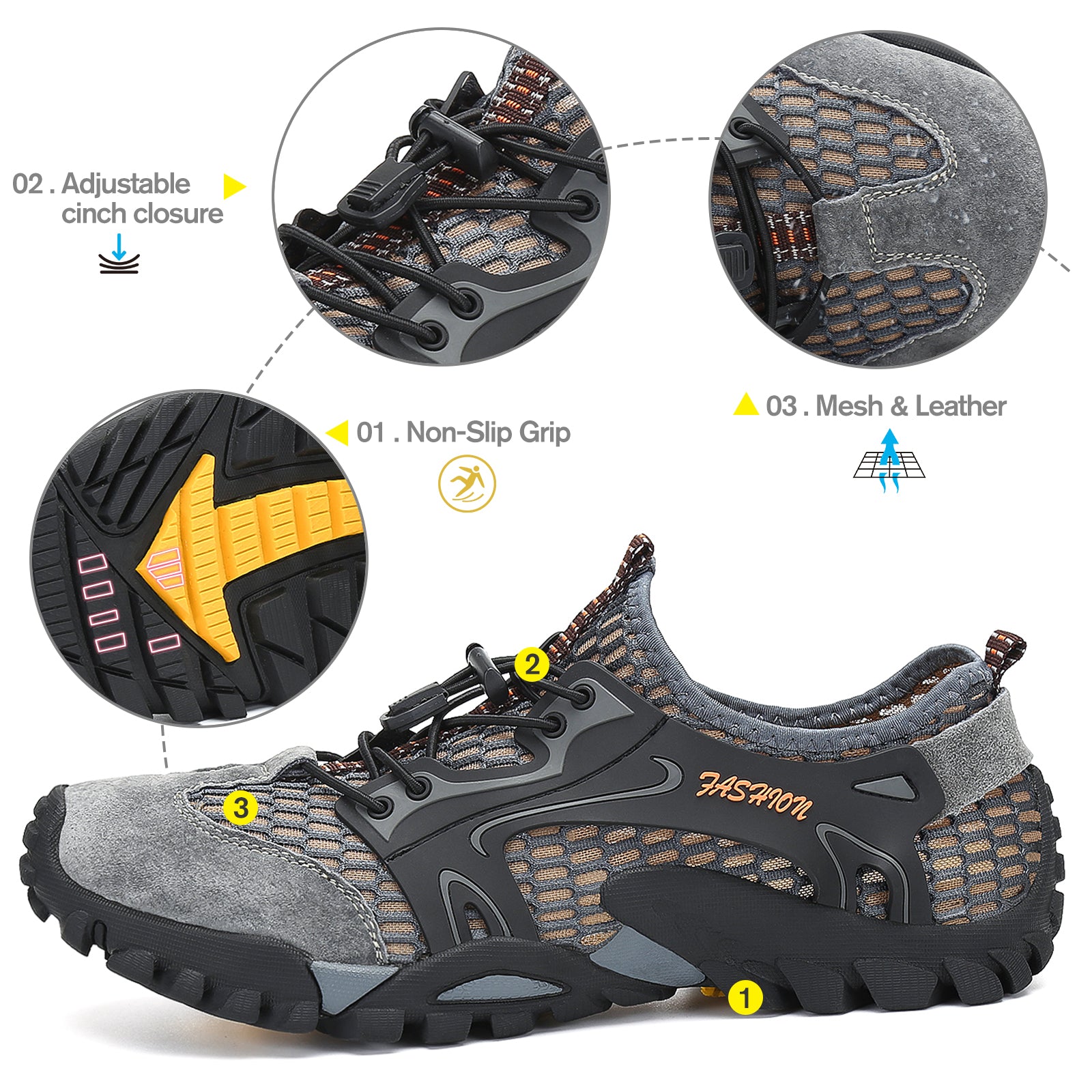 Durable Material – Mesh and leather upper with sturdy rubber sole.
